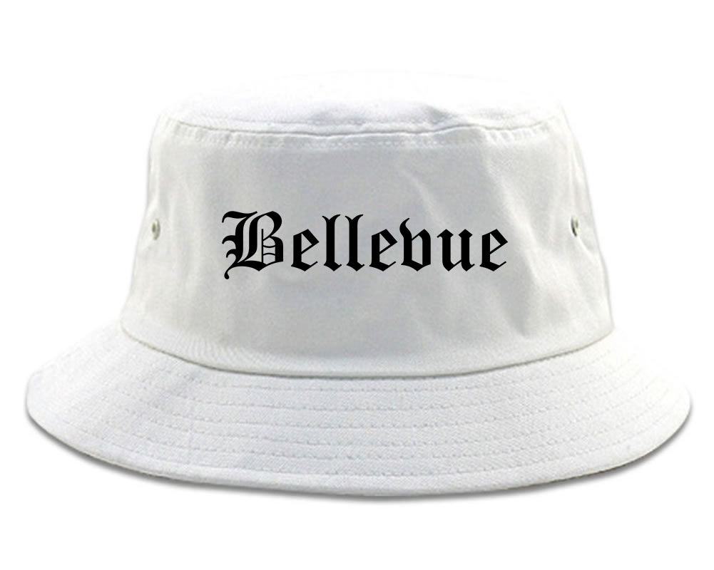 Bellevue Wisconsin WI Old English Mens Bucket Hat printed by Urban Gear. Rep your city or town in one of our hats for your state.