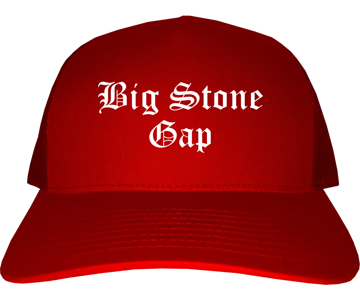 Big Stone Gap Virginia VA Old English Mens Trucker Hat Cap printed by Urban Gear. Rep your city or town in one of our hats for your state.