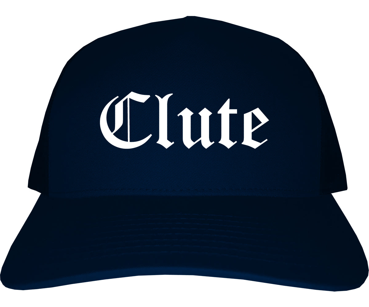 Clute Texas TX Old English Mens Trucker Hat Cap printed by Urban Gear. Rep your city or town in one of our hats for your state.