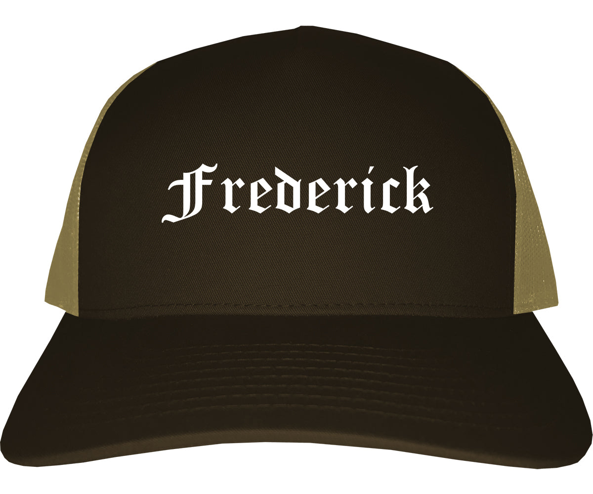 Frederick Colorado CO Old English Mens Trucker Hat Cap printed by Urban Gear. Rep your city or town in one of our hats for your state.