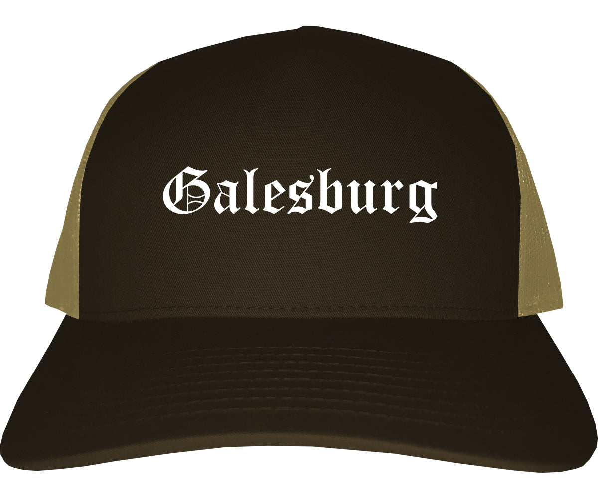 Galesburg Illinois IL Old English Mens Trucker Hat Cap printed by Urban Gear. Rep your city or town in one of our hats for your state.