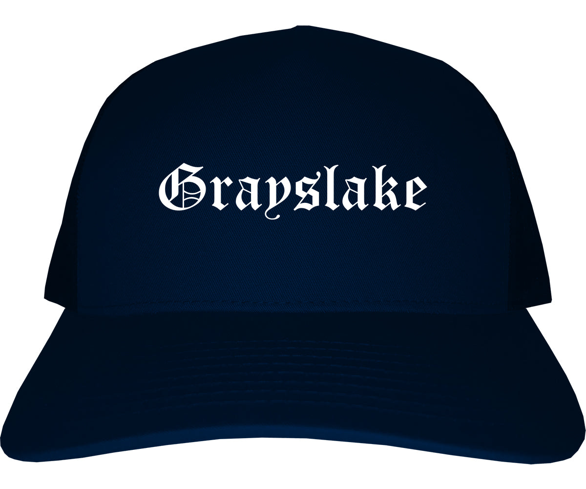 Grayslake Illinois IL Old English Mens Trucker Hat Cap printed by Urban Gear. Rep your city or town in one of our hats for your state.