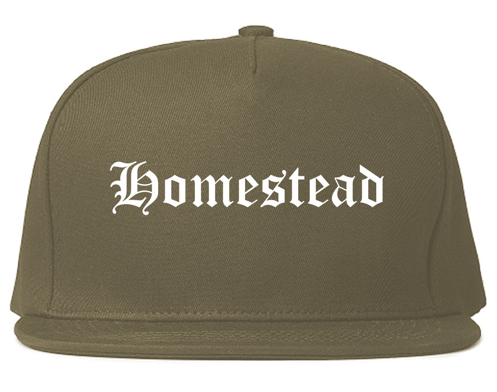 Homestead Florida FL Old English Mens Snapback Hat printed by Urban Gear. Rep your city or town in one of our hats for your state.