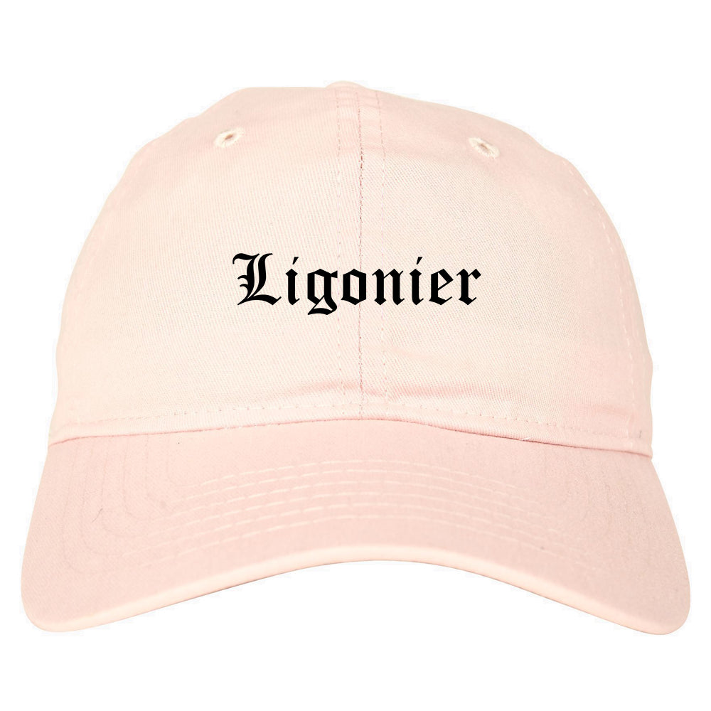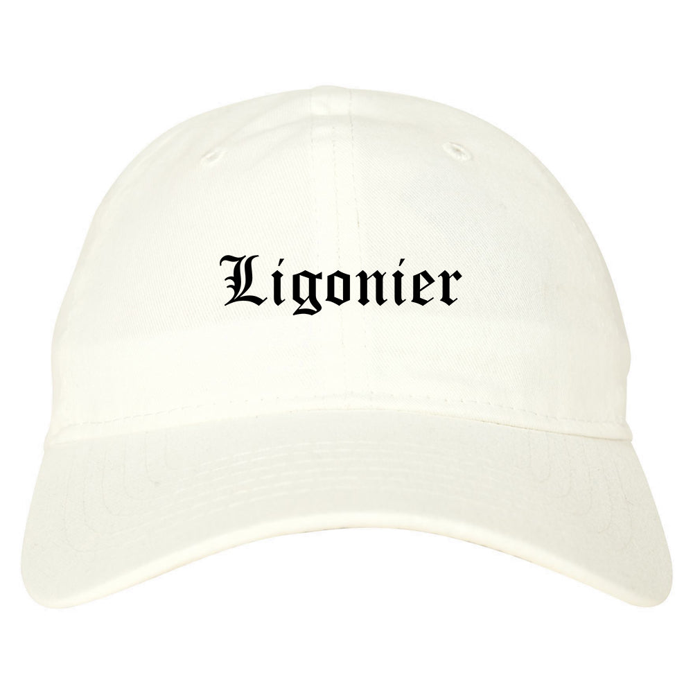 Ligonier Indiana IN Old English Mens Dad Hat Baseball Cap printed by Urban Gear. Rep your city or town in one of our hats for your state.