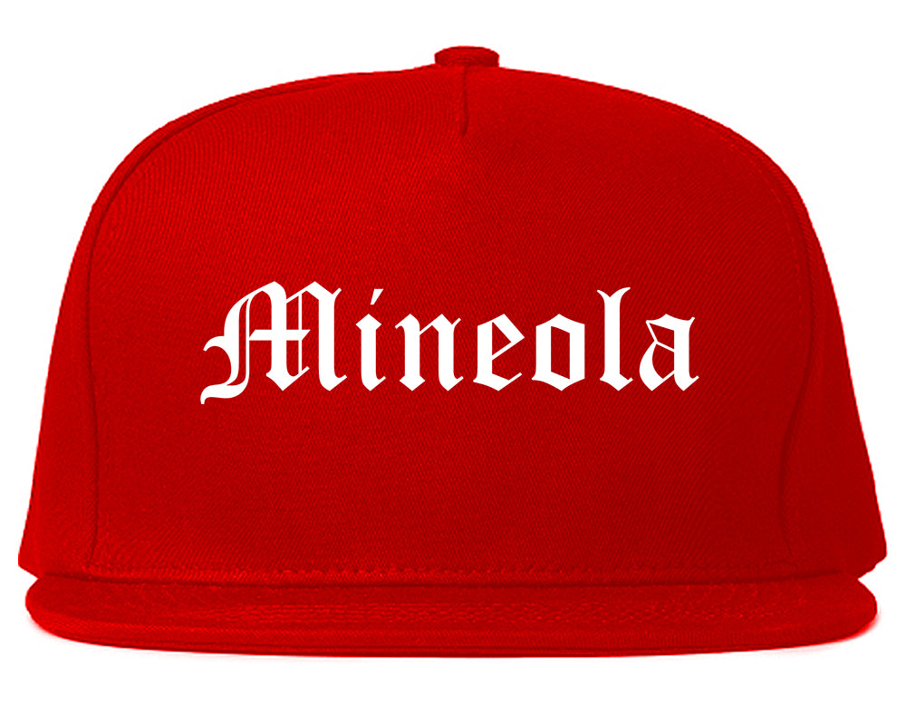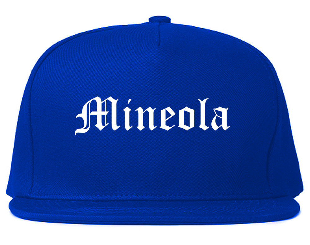 Mineola New York NY Old English Mens Snapback Hat printed by Urban Gear. Rep your city or town in one of our hats for your state.