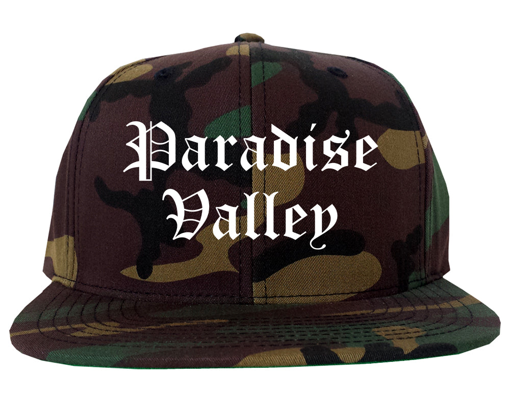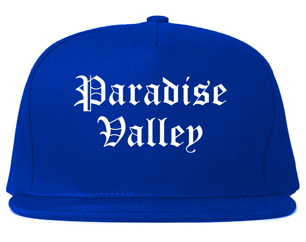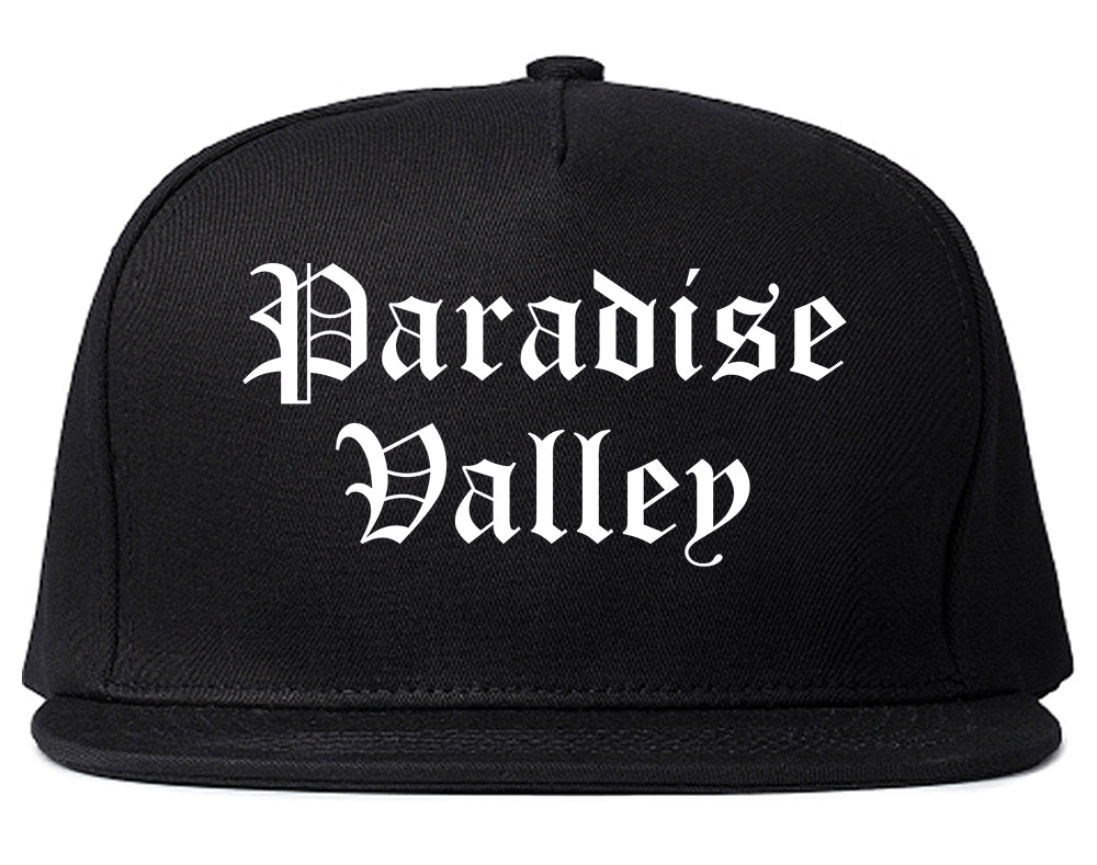 Paradise Valley Arizona AZ Old English Mens Snapback Hat printed by Urban Gear. Rep your city or town in one of our hats for your state.