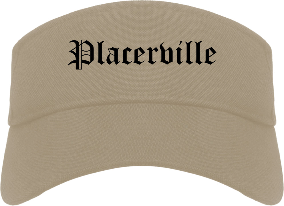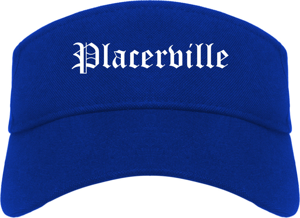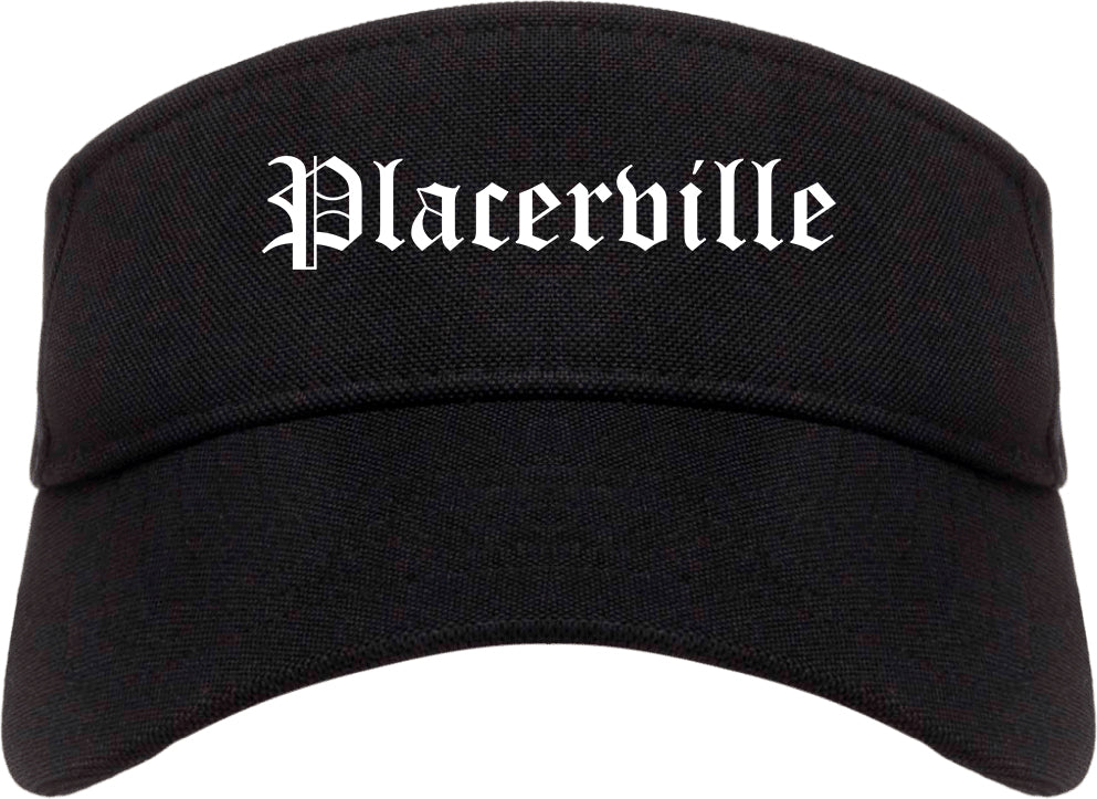 Placerville California CA Old English Mens Visor Cap Hat printed by Urban Gear. Rep your city or town in one of our sun visor hats for your state. Perfect for both men and women.