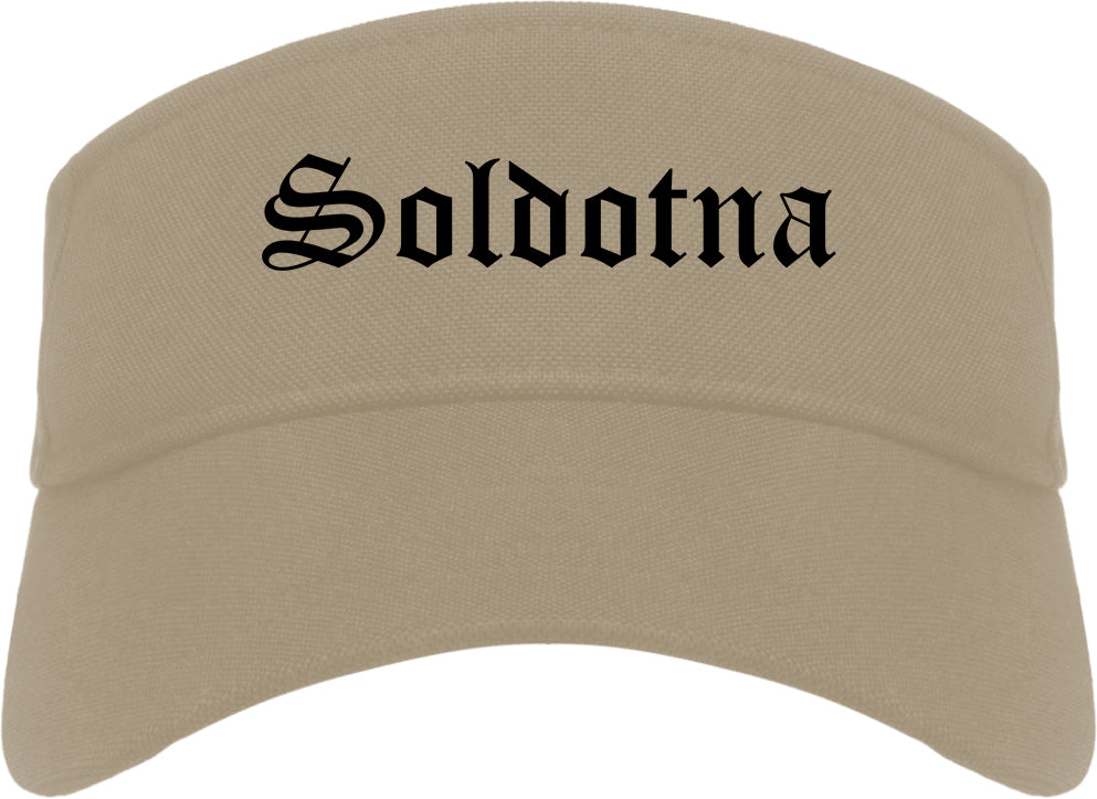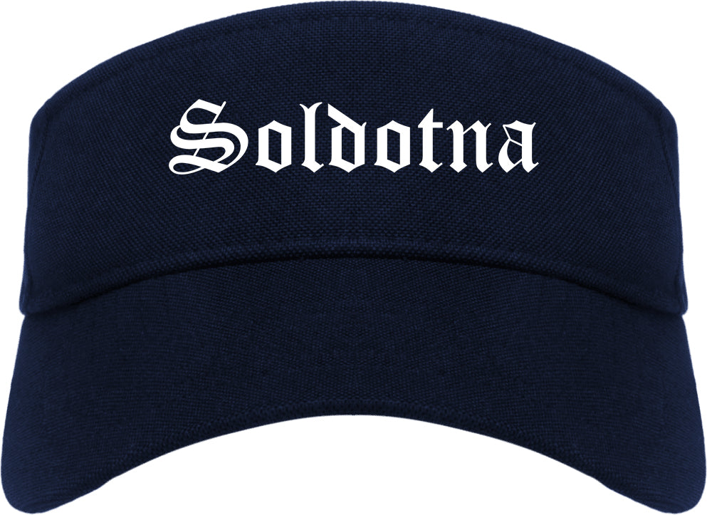Soldotna Alaska AK Old English Mens Visor Cap Hat printed by Urban Gear. Rep your city or town in one of our sun visor hats for your state. Perfect for both men and women.